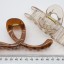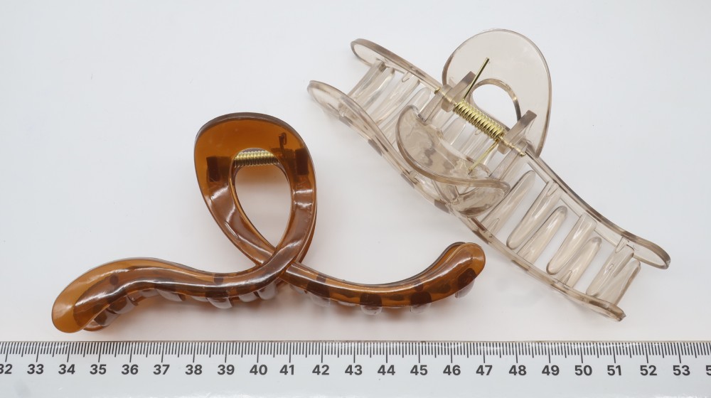Глянцевый полупрозрачный пластик. Длина 13,5 см, высота 6 см, золотая пружина.