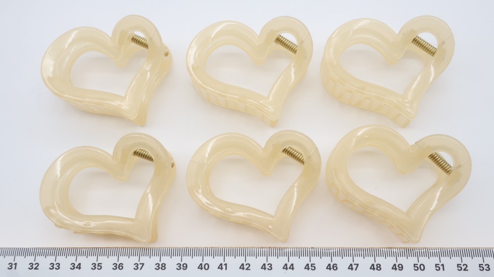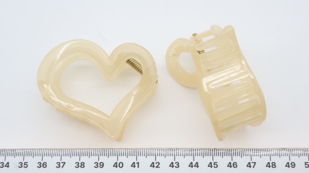 Глянцевый полупрозрачный пластик. Длина 6 см, высота 5 см, золотая пружина.