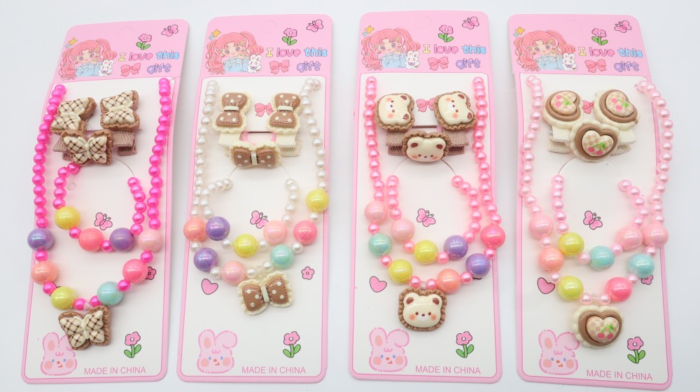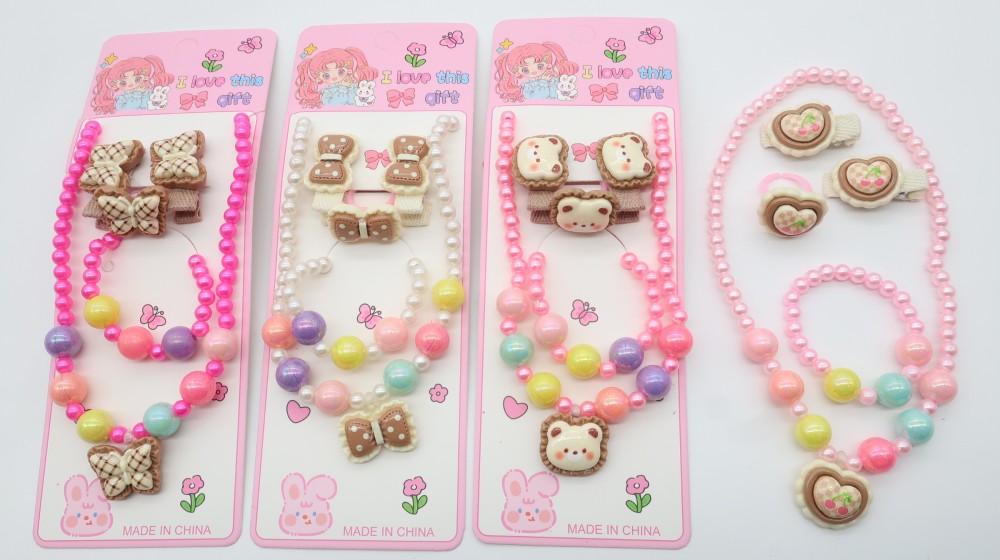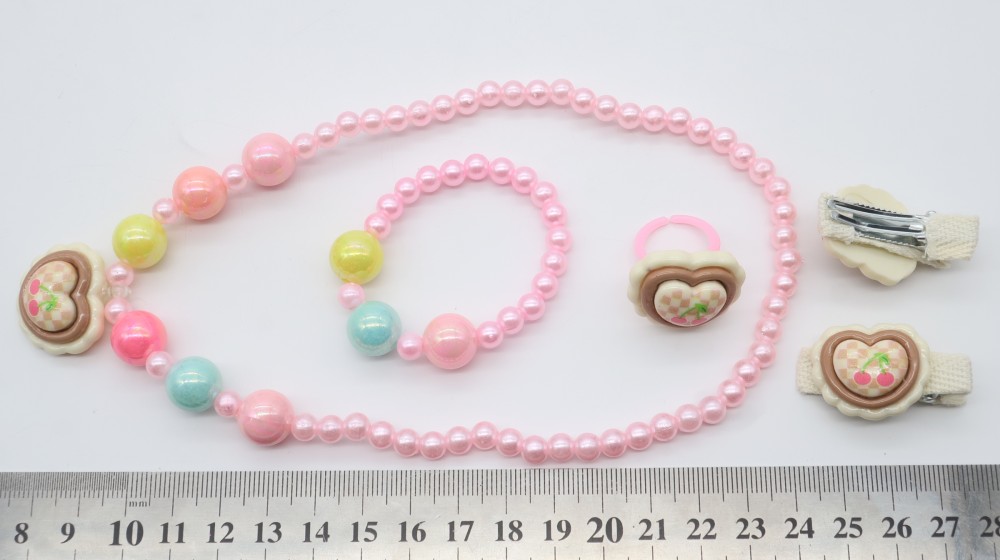 Пластик, жемчуг, резинка. Набор: бусы, браслет, кольцо, 2 зажима