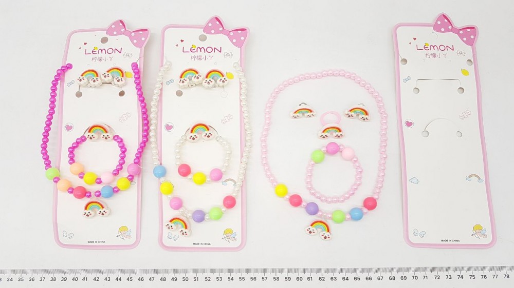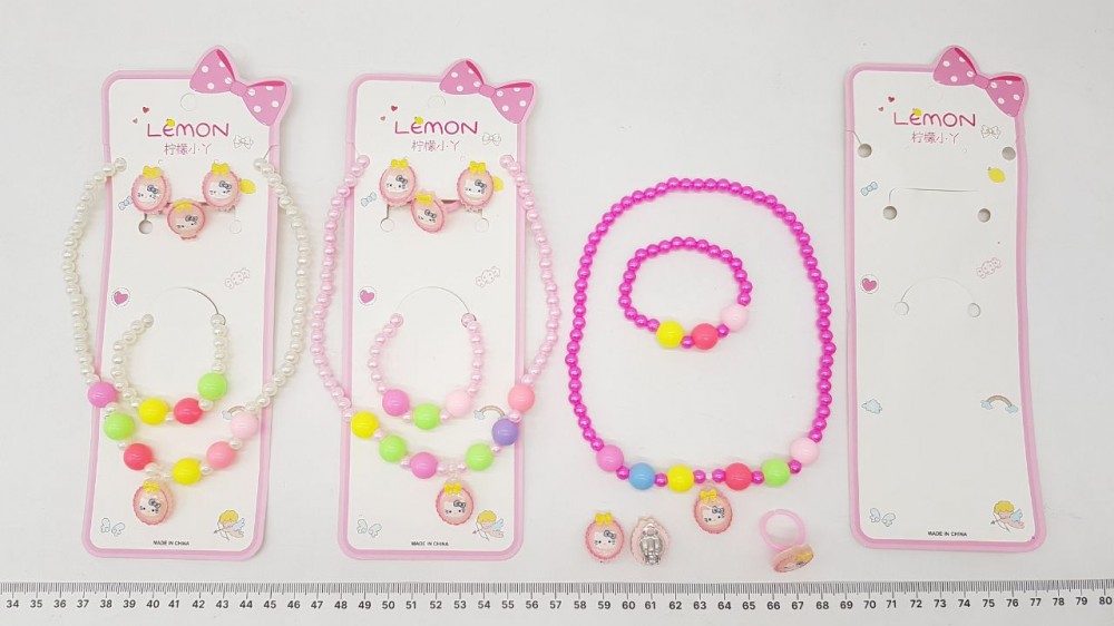 Пластик. В набор входит: бусы, браслет, серьги и кольцо.
