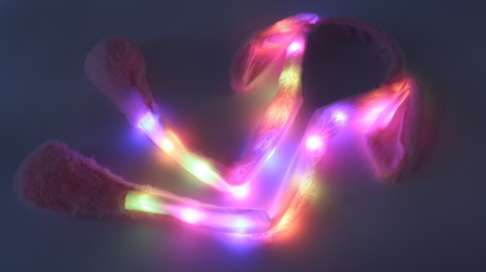 Искусственный мех. При нажатии груш ушки поднимаются. Светятся при нажатии кнопки. Имеет три режима подсветки.
