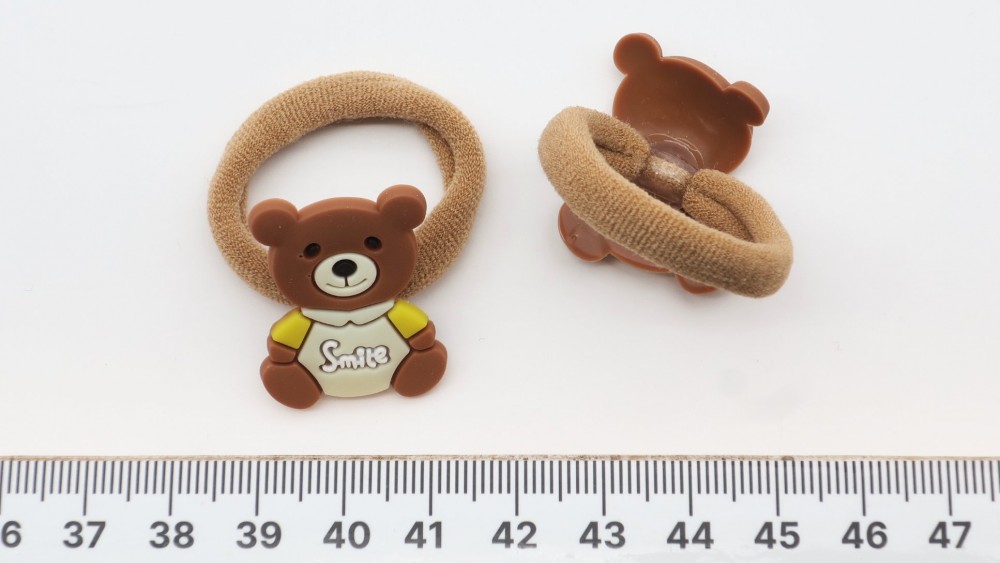 Нейлон, силикон. Резинка 3 см. Мишка 2,3 на 3 см.