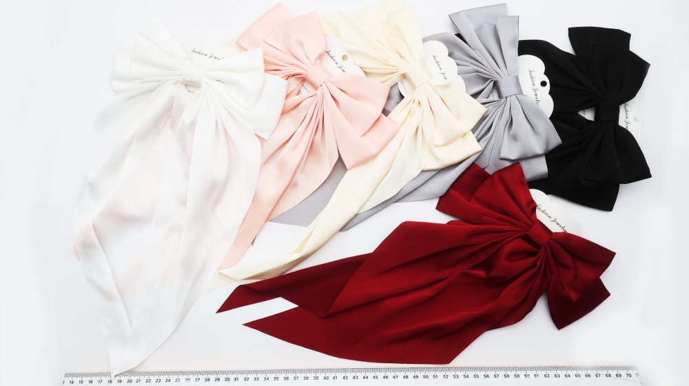 Иск. шелк, металл, хедер. Бант 20 на 9 см., хвосты 32 см., автомат 9 см.