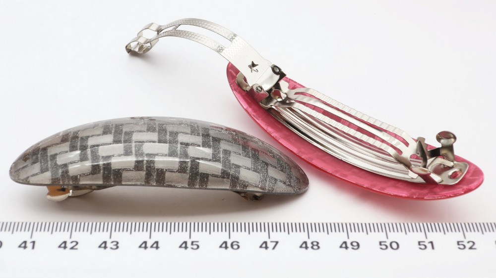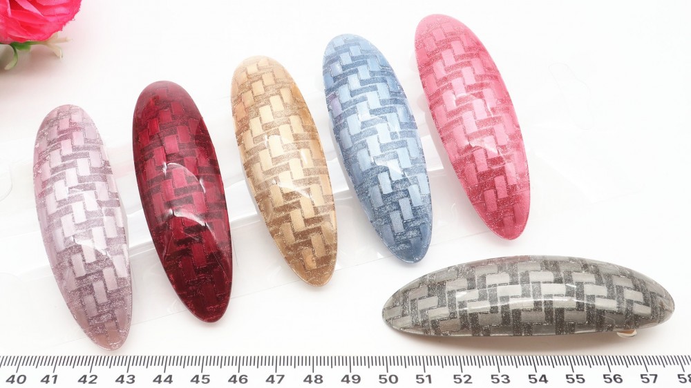 Глянцевый пластик, блёстки, металл. Длина 9 см., ширина 2,5 см